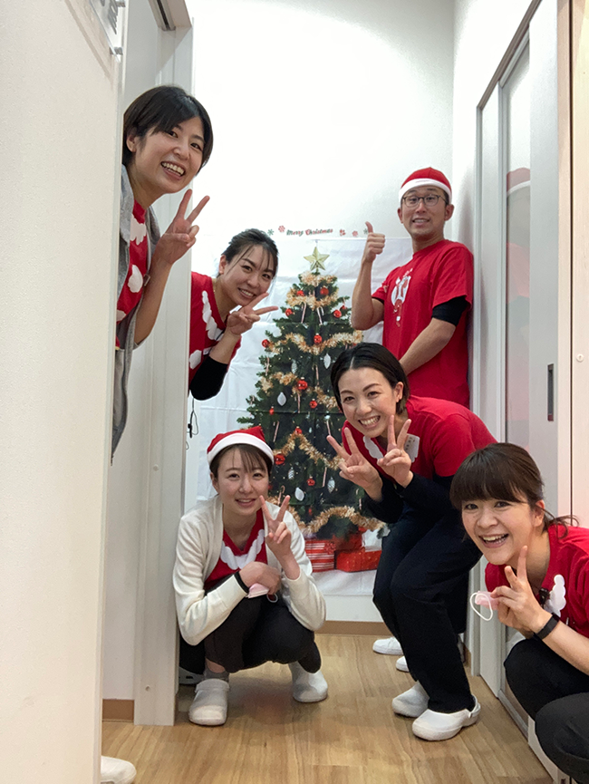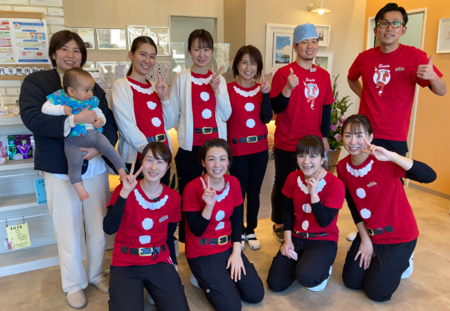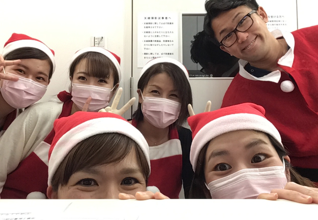 年齢を問わず意見を出し合い、チームワークを大切にしながら診療を行なっています。クリスマスやハロウィンなどのイベントをスタッフみんなで楽しみながら診療しています。