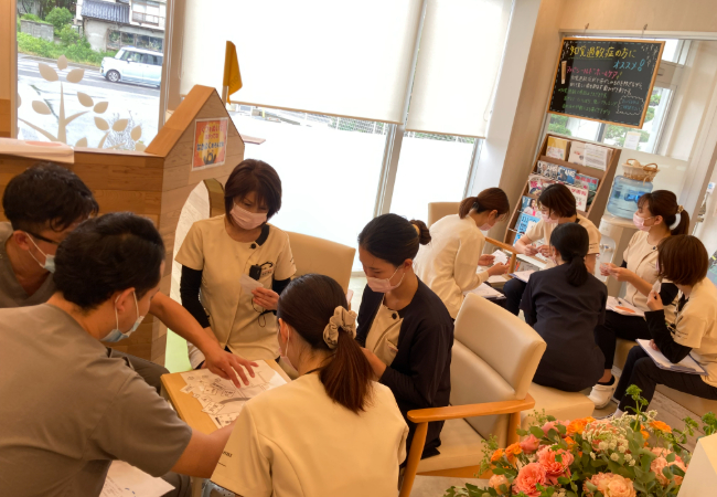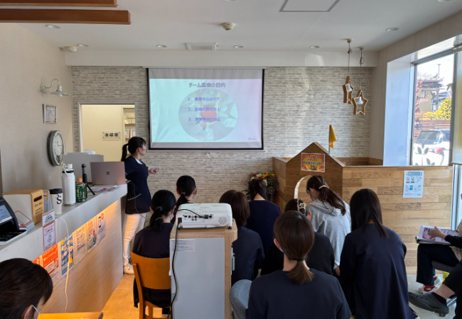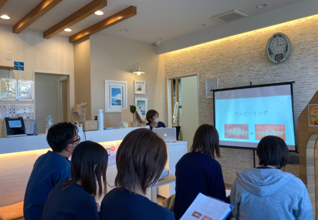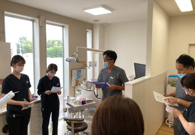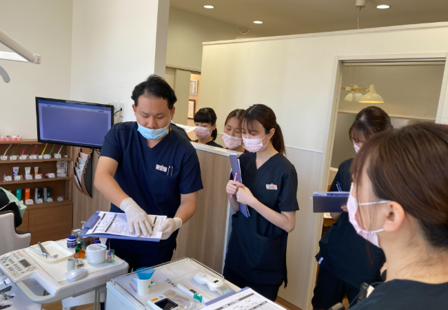 月2回水曜の午前診療終わりに30分ほどの勉強会をします。スタッフが輪番制で司会をし、その日に行う議題を用意し、皆で学びます。時に実技練習も行います。